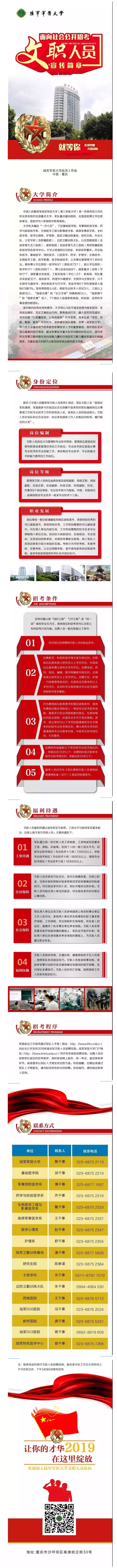 届时,军委政治工作部将通过军队人才网向社会公开发布2019年度全军文职人员招聘信息。而陆军军医大学门户网站也将同步发布本校招聘信息。同学们应按照军队规定的招考程序,按时参加网上报名、统一考试、面试体检等各环节,具体要求以军队人才网所发布的消息为准。尤其要注意,应聘必须通过军队人才网报名,勿要信其他任何招聘形式哦。