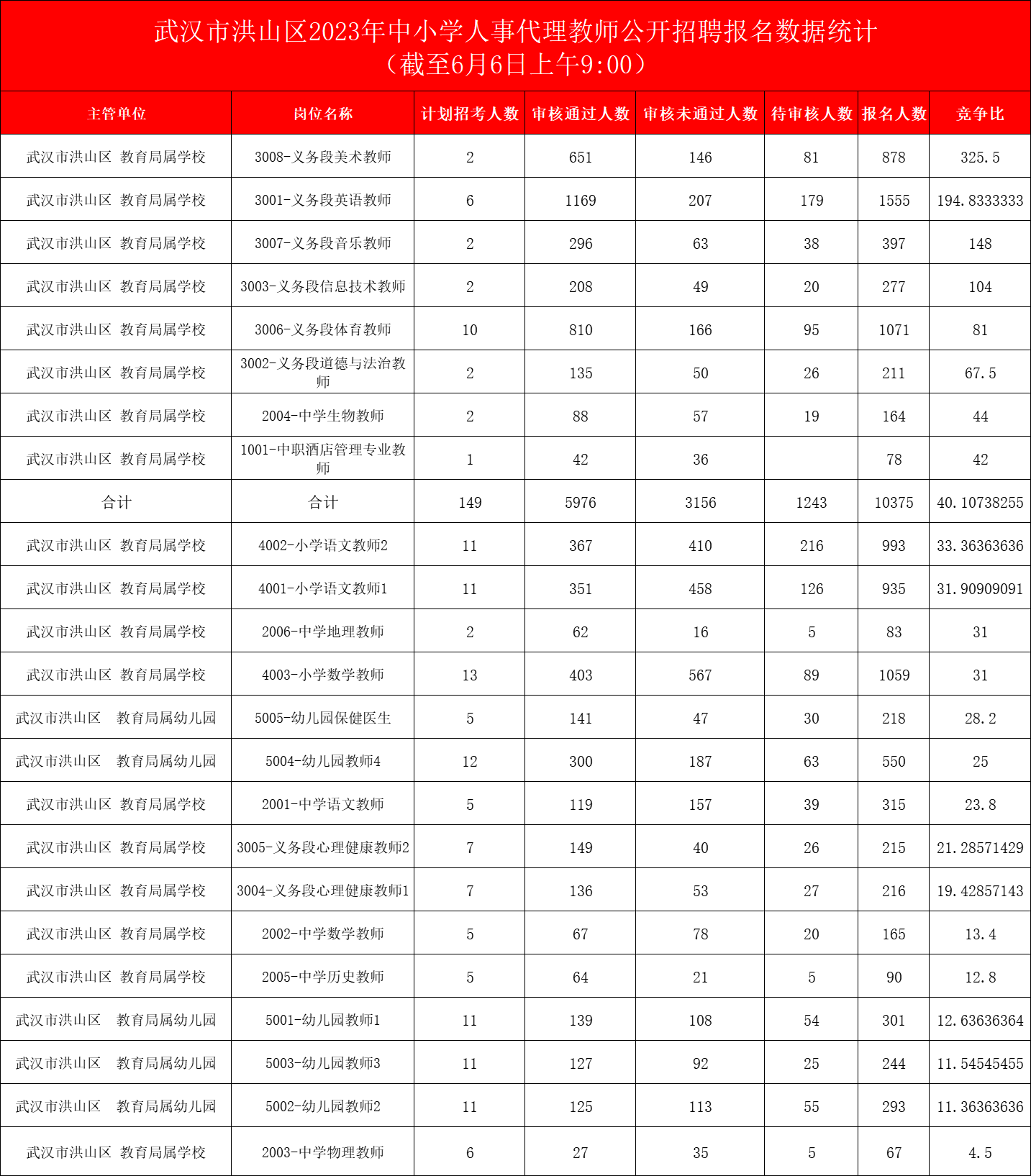 2023武汉市洪山区教师招聘149人报名数据:截至6月6日9时,10375人报名,5976人过审