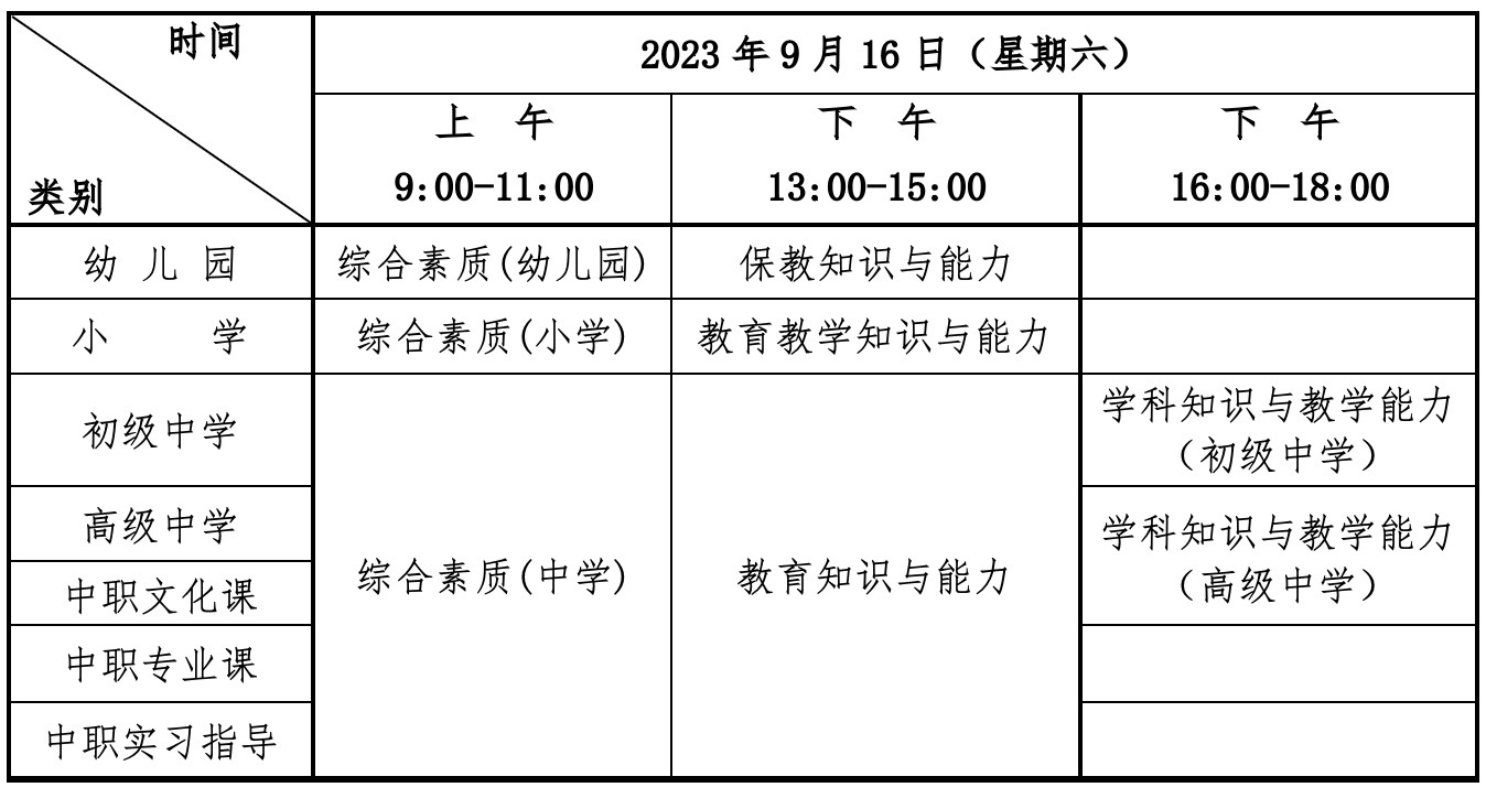 3.选择初中、高中、中职文化课类别中“心理健康教育”“日语”“俄语”学科的考生,笔试科目三《学科知识与教学能力》暂不考试,结合面试一并考核;选择小学类别中“心理健康教育”“信息技术”“小学全科”的考生,笔试科目为《综合素质》(代码:201)和《教育教学知识与能力》(代码:202)。