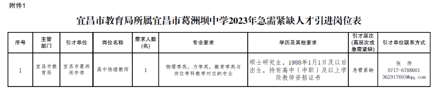 宜昌市教育局所属宜昌市葛洲坝中学2023年急需紧缺人才引进公告