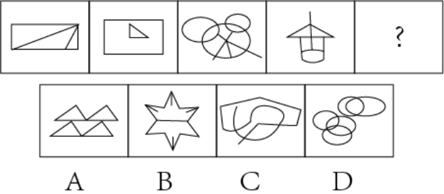 【解析】本题考查数量类-线。图形出现绞丝图,优先考虑一笔画,每幅图的最少笔划数为1笔、2笔、3笔、4笔、?a项1笔,排除;b项5笔;c项,1笔,排除;d项2笔,因此,选择b选项。