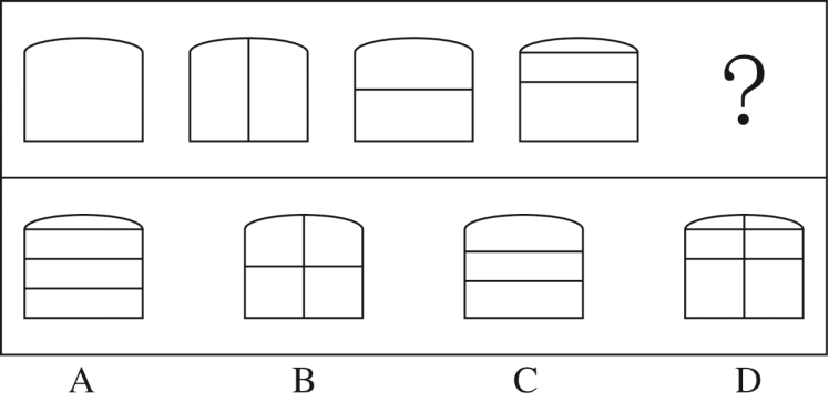 【解析】本题考查数量类-角。一条式,从左到右找规律。题干图形中直角的个数依次为2、4、6、8,呈等差数列,问号处图形应有10个直角,只有c项符合。因此,选择c选项。