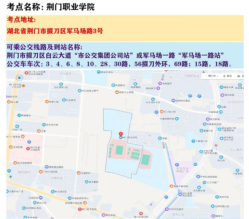 2.荆门职业学院(荆门市掇刀区军马场路3号)