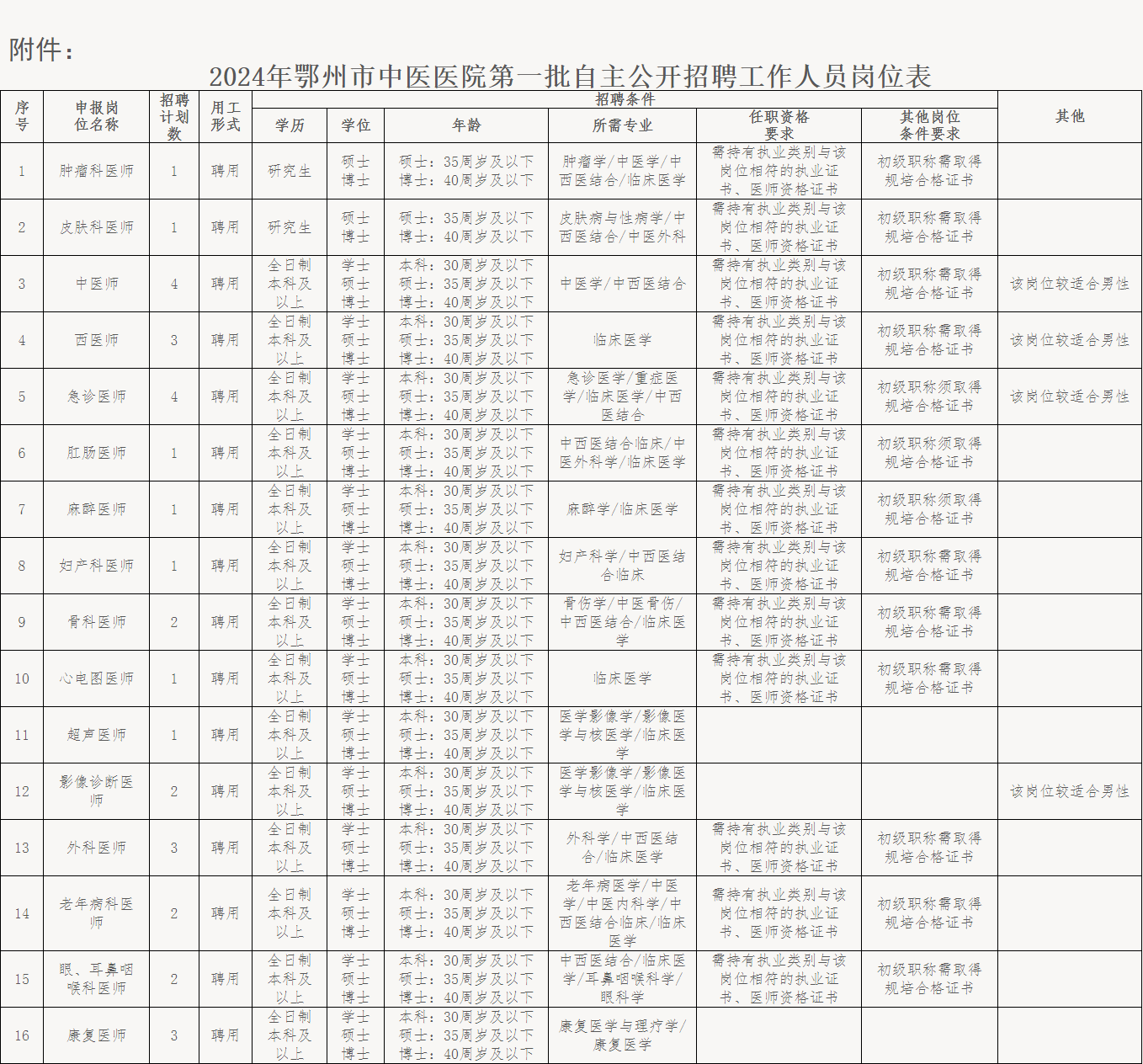 学历、专业、年龄、职称、工作经历及其他条件详见附件《2024年鄂州市中医医院招聘岗位表》。