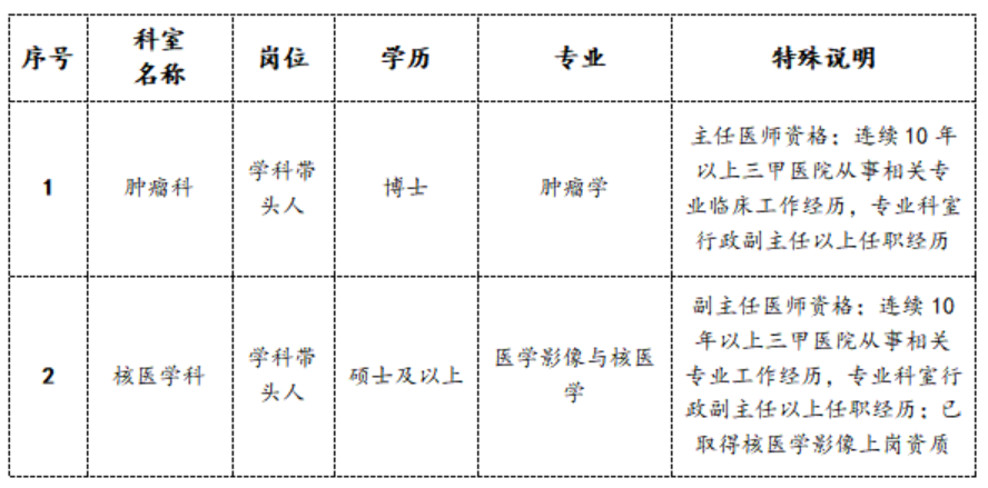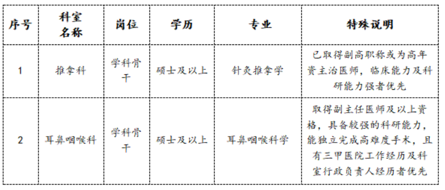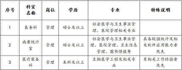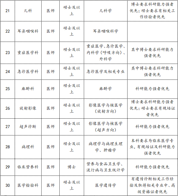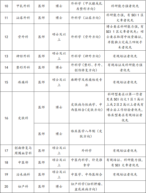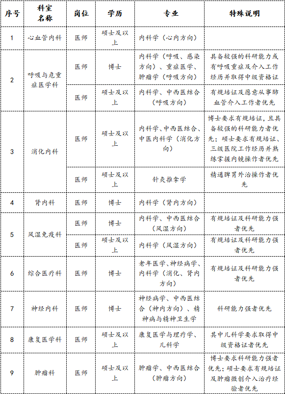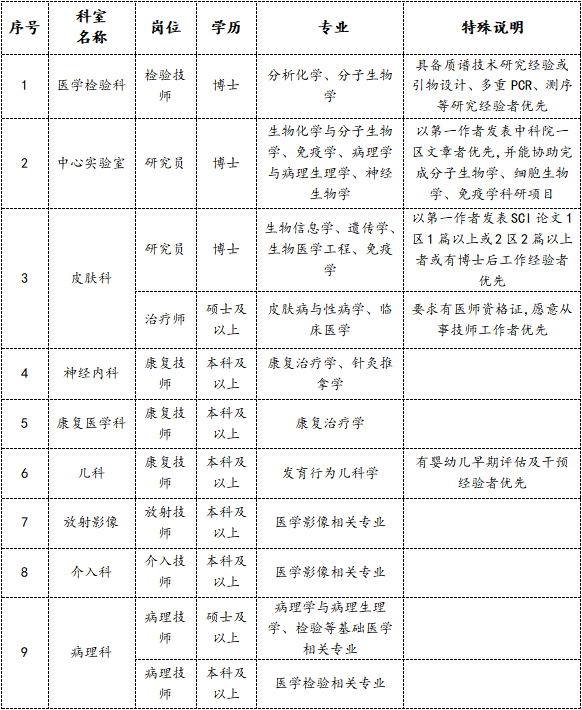 (3)优先录用博士、具备三甲医院相关工作经历者,临床8年制博士可不受专业限制,应聘各科室;
