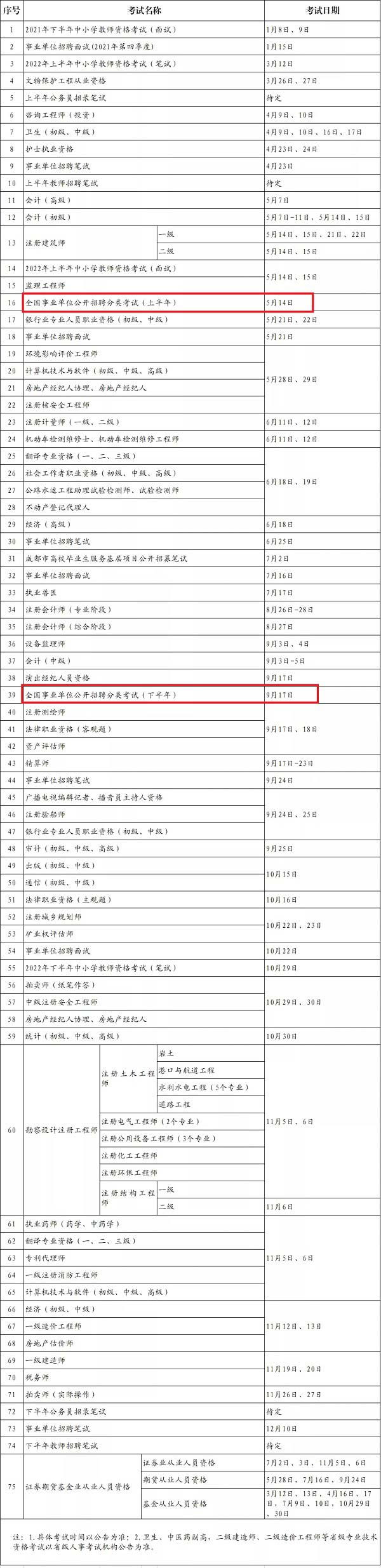 ①2022年上半年全国事业单位分类招聘考试于5月14日考试;