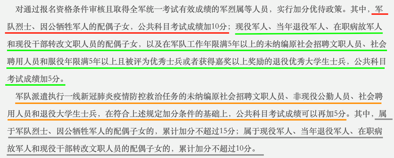 今年的加分对象扩充主要体现了优待军人家属,为解决军人后顾之忧的拥军优属措施。我们知道,拥军优属工作是维护国家长治久安、社会稳定、经济发展的重要工作之一,是随着时代发展、军队发展变化而变化的。另外,为奖励抗击疫情,今年文职招考也对为社会作出突出贡献的人群实施了加分政策,体现大国人文情怀。