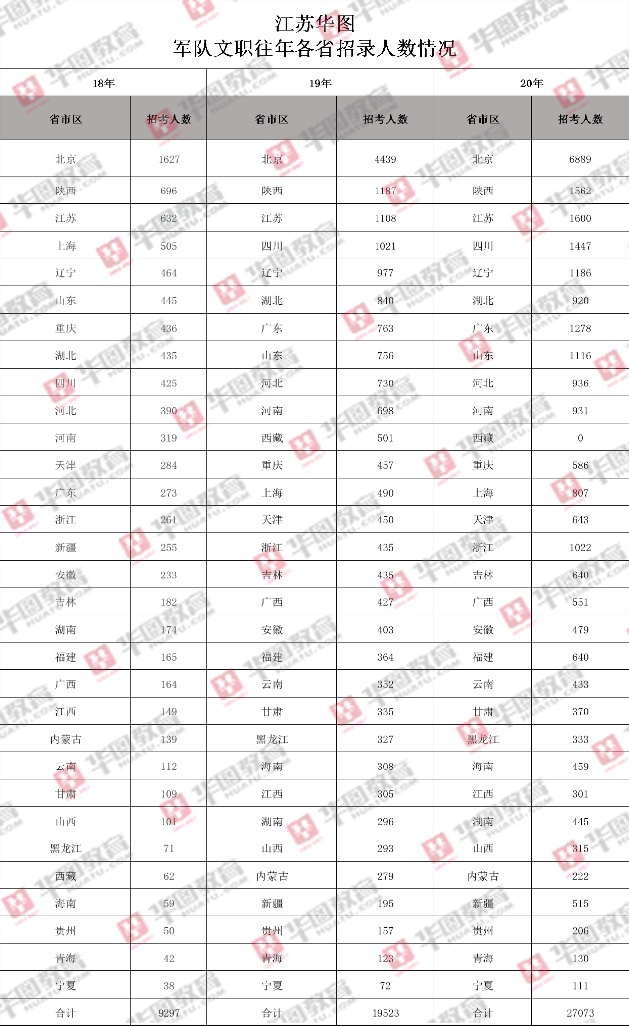 军队文职往年各省招录人数情况