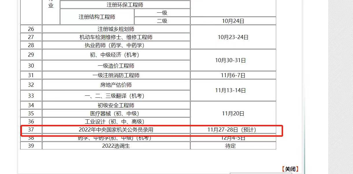 | 37 | 2022年中央国家机关公务员录用 | 11月27-28日(预计) | |||
