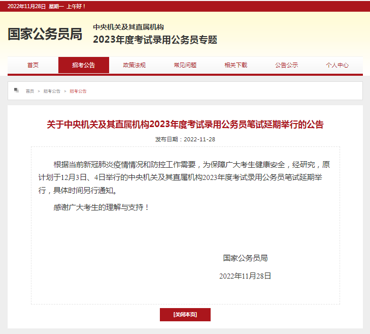 根据当前新冠肺炎疫情情况和防控工作需要,为保障广大考生健康安全,经研究,原计划于12月3日、4日举行的中央机关及其直属机构2023年度考试录用公务员笔试延期举行,具体时间另行通知。