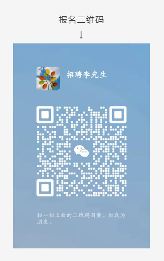 应聘人员将报名资料电子版发送到指定微信账号,微信号见下方报名手机号,报名资料包含:本人有效身份证、户口簿、学历证、学信网学籍证明和相关技能证书的扫描件或清晰照片、近期1寸蓝底免冠彩照。