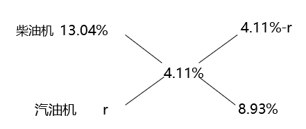 第三步,全国内燃机为整体,柴油机与汽油机为部分,利用十字交叉法,两个部分与整体的增长率交叉,得到的比值是两个部分基期量之比(用现期量替代),设汽油机的增长率为r,代入数据可得