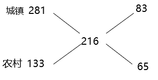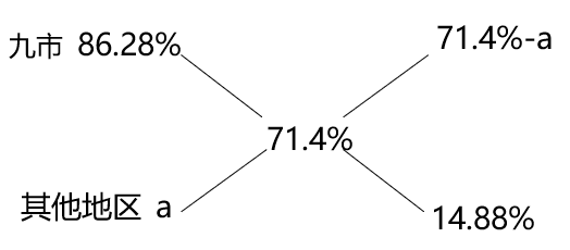 第三步,广东省=珠三角九市 其他地区,根据混合比重口诀“整体比重介于两个部分比重之间,且偏向于整体量较大的一方”, 可知除珠三角 九市之外的城镇化率<71.4%<86.28%,无法排除选项。比重十字交叉得到整体量之比, 设除珠 三角九市之外的其他地区城镇化率为a,则可得:选项为区间类,从左向右截取前三位,可得,解得a≈71.4%-1.25×14.88%≈71.4%-18.6%=52.8%,在c选项范围内。