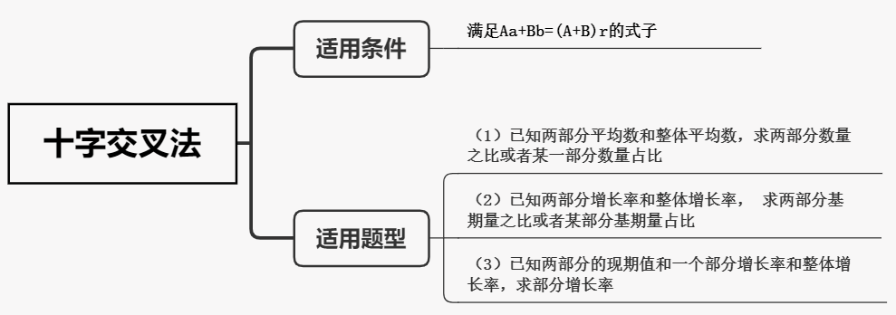 总体来说此类题型 偏 难, 需要大家熟记上述的介绍几类题型 特点 , 那 遇到 十字交叉法的问题 就可以迎刃而解。 希望各位小伙伴们在今后的学习中,多去 练习多刷题 。在此再附上一张思维导图,方便大家记忆。