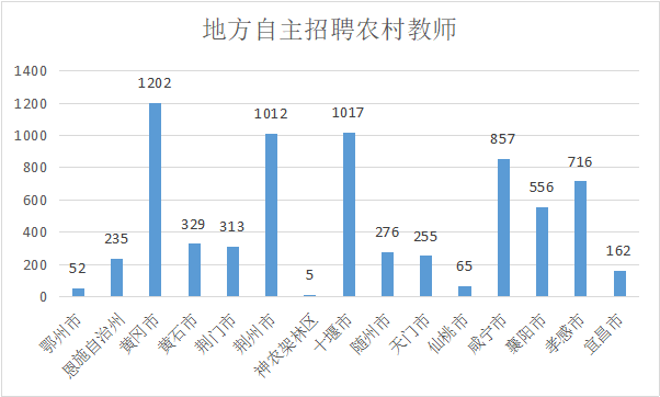 此次地方自主招聘农村教师共计招录7052人,各个地区招录情况如下:其中黄冈市招录最多达到1202人,其次是十堰市招录1017人,荆州市招录1012人,最少的是神农架林区只招录5人,考生可以根据自己华图教师职位库查看职位相关分数线及竞争比来合理选着适合自己的岗位。