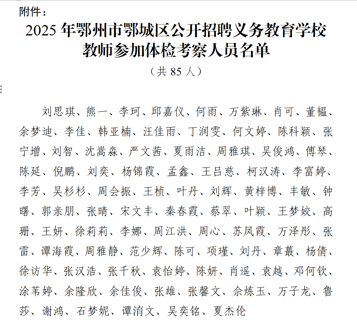 根据《鄂州市鄂城区2025年公开招聘义务教育学校教师公告》(鄂城教师发〔2025〕5号)要求,岗位按照考生考试综合成绩,从高分到低分按招聘计划数1∶1的比例确定进入体检考察人选。现将有关情况公告如下: