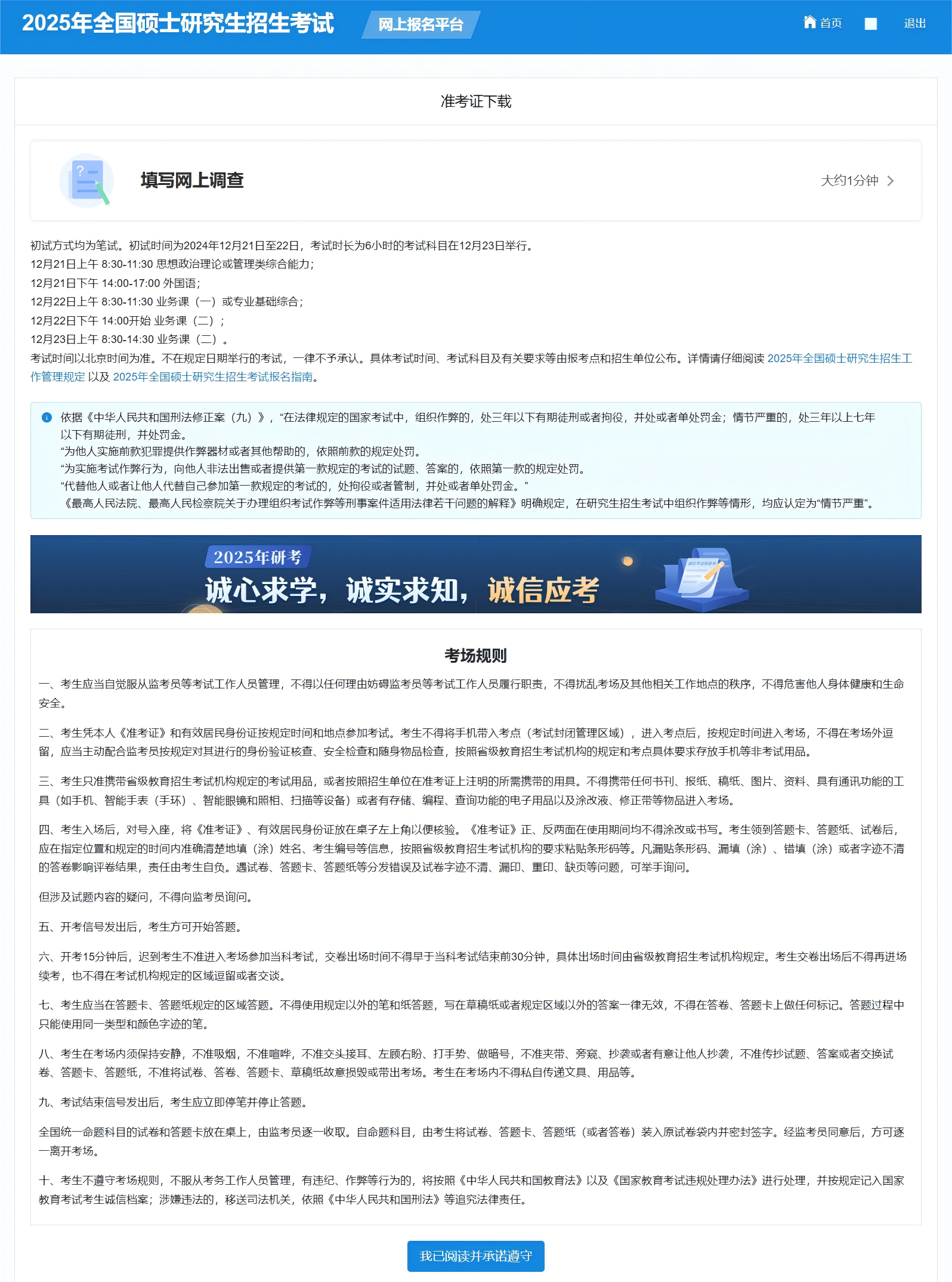 进入研招网报平台凯发app凯发app官网首页后,你将看到初试时间提醒、考场规则等内容,这个页面上的提示要认真阅读!