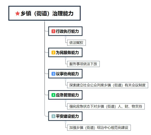 《意见》明确了基层政权治理能力的五项内容,也就是说,未来乡镇(街道)应当具备“执行、服务、协商、应急、平安”五个方面的能力。如下图: