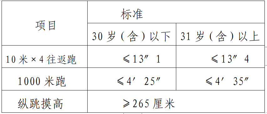 考生综合成绩采用百分制折算。综合成绩=笔试成绩×0.5 面试成绩×0.5。体能测试参照《公安机关录用人民警察体能测试项目和标准》执行。体能测试共3个项目(项目暨合格标准见下图),每项体能测试成绩由考生当场签字确认。